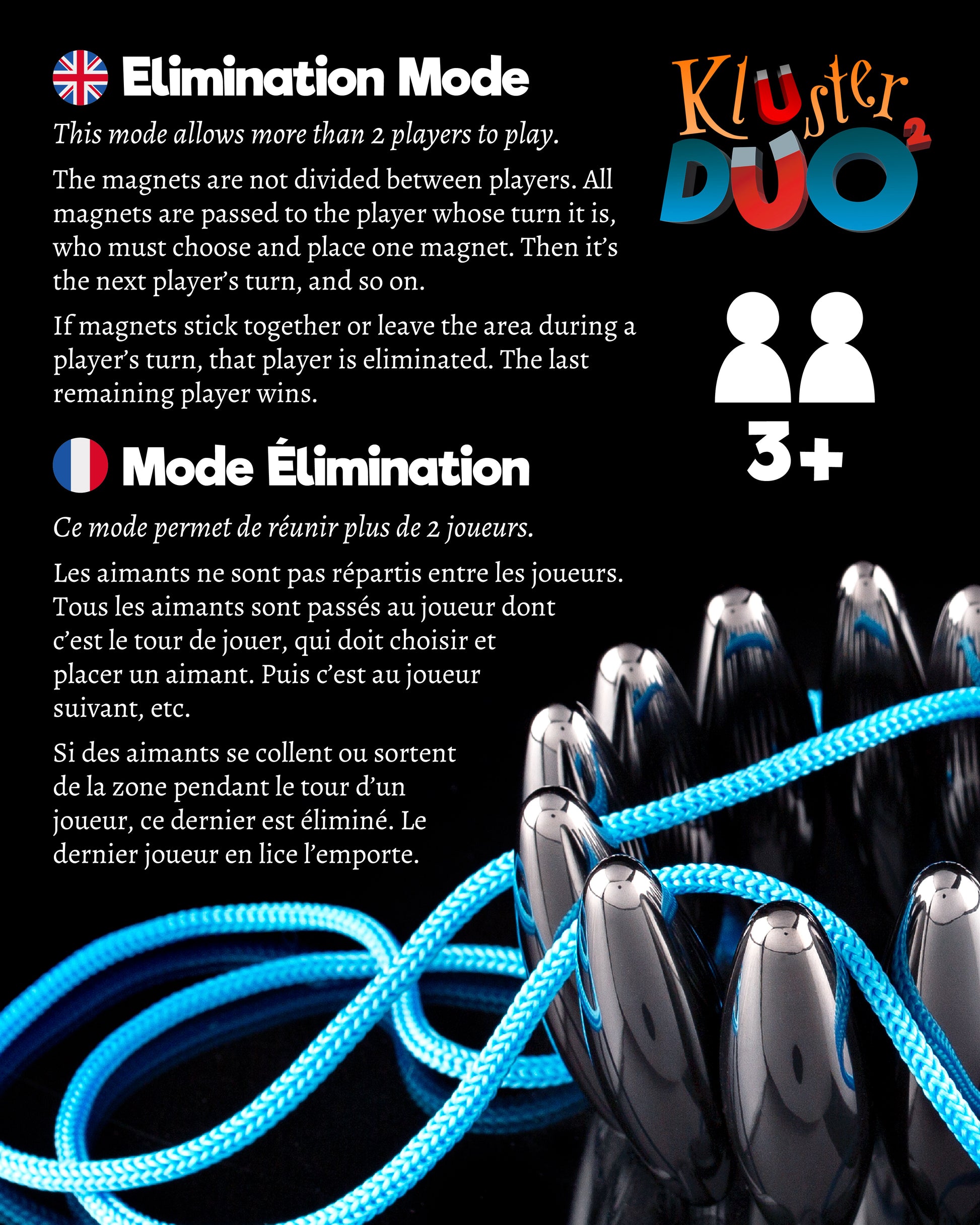 Dans Kluster DUO, tout comme dans Kluster Classic, l'objectif du jeu est simple. Les aimants sont répartis équitablement entre les joueurs, qui doivent tour à tour placer un aimant dans la zone délimitée par la corde. Cependant, lorsque des aimants s’aimantent pendant son tour, le joueur doit les récupérer! À son tour, un joueur a la possibilité de déplacer la corde ou d'essayer de repousser les aimants avec la force magnétique. Le premier joueur à poser tous ses aimants remporte la partie.